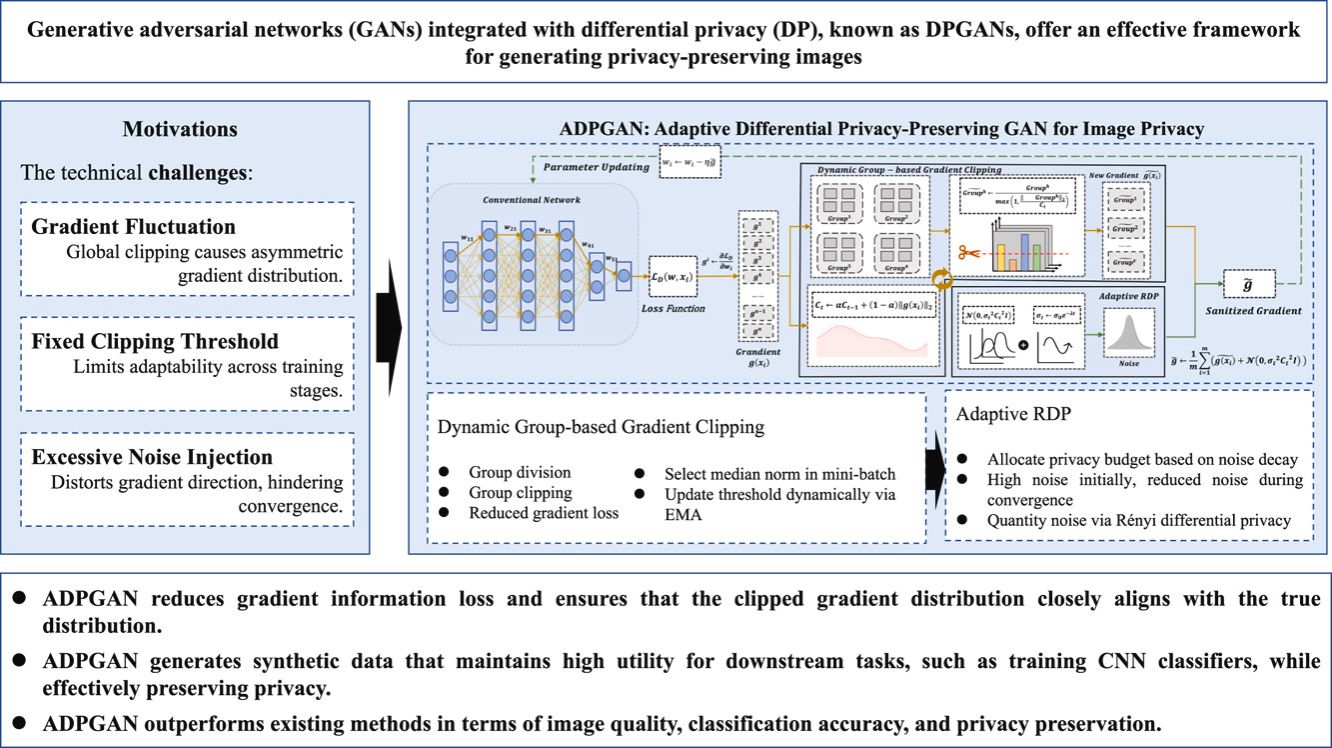 With the development of image acquisition and social network technologies, the volume of image data has surged, highlighting the contradiction between data publication and privacy security. In this context, generative adversarial networks (GANs) provide a breakthrough solution to strike a balance between image data development and privacy protection. Many scholars have enhanced privacy protection by adding a certain scale of noise during GAN training, enabling the generation of highly useful synthetic data that satisfies privacy requirements. However, the introduction of noise in GANs leads to model instability and compromises usability. We focus on the application of GANs in the field of image privacy protection and propose an adaptive differential privacy-preserving GAN framework, called ADPGAN. First, we introduce a dynamic group-based gradient clipping method, which divides gradients into multiple subgroups for truncation and employs exponential moving averages to continuously optimize the clipping threshold. Theoretical analysis demonstrates that this dynamic adjustment mechanism significantly mitigates the information loss inherent in traditional fixed-threshold clipping methods. Second, we design an adaptive Rényi differential privacy (RDP) mechanism that dynamically optimizes noise levels based on the model’s training state. By leveraging Rényi differential privacy to precisely quantify noise, this mechanism further ensures the stability and performance of ADPGAN, effectively improving convergence speed and the quality of generated images. Finally, we conduct experimental validation on three benchmark image datasets: MNIST, Fashion-MNIST, and Flowers-Recognition. The results show that ADPGAN achieves significant improvements compared to state-of-the-art methods (with the downstream classification accuracy increasing by up to 7.44%) while providing image privacy protection. Furthermore, a rigorous privacy analysis confirms that the proposed method fully complies with differential privacy requirements, offering a solid theoretical and practical foundation for the application of GANs in privacy-preserving scenarios.
