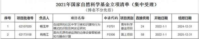 近日,国家自然科学基金委员会公布了《关于2021年国家自然科学基金集中接收申请项目评审结果的通告》,中心两位教师杨玉芹、肖克江喜获2021年度国家自然科学基金课题青年科学基金项目、面上项目立项各1项。