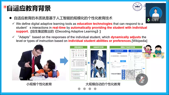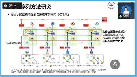 如何基于学生学习的大数据,精准可解释评估学生知识的掌握情况?如何构建满足有效的个性化测试卷,精准评估学生知识掌握情况?在给定认知状态情况下,如何推荐满足多教学目标的个性化学习内容?如何基于学生学习及时的反馈,在满足教学逻辑及教学目标条件下及时调整学习序列?报告中,马海平副教授从自适应学习的背景、学生认知建模的方法、自适应学习方法三个方面展开,就以上问题介绍了自己及团队的一些探索和成果。