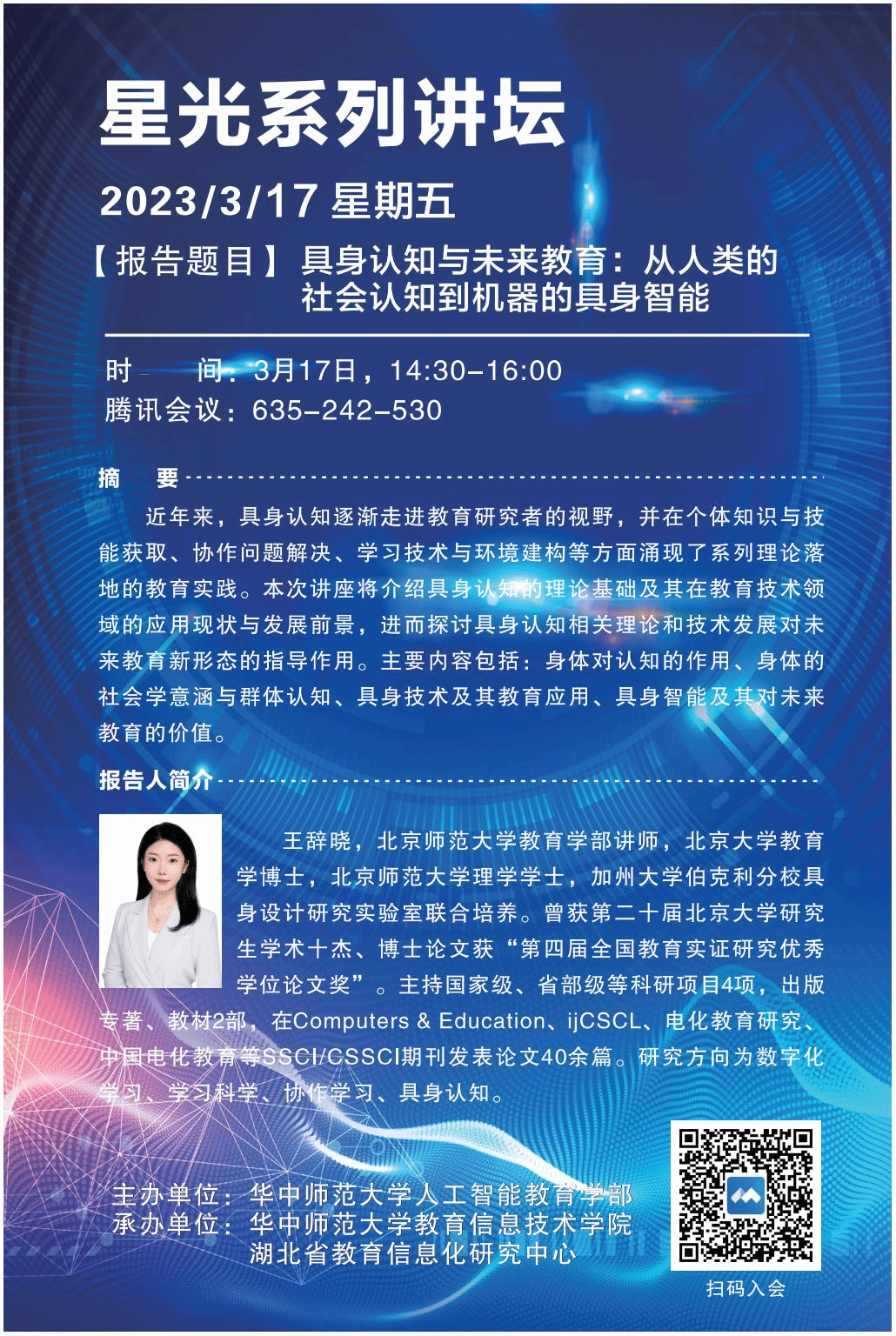 近年来,具身认知逐渐走进教育研究者的视野,并在个体知识与技能获取、协作问题解决、学习技术与环境建构等方面涌现了系列理论落地的教育实践。本次讲座将介绍具身认知的理论基础及其在教育技术领域的应用现状与发展前景,进而探讨具身认知相关理论和技术发展对未来教育新形态的指导作用。主要内容包括:身体对认知的作用、身体的社会学意涵与群体认知、具身技术及其教育应用、具身智能及其对未来教育的价值。