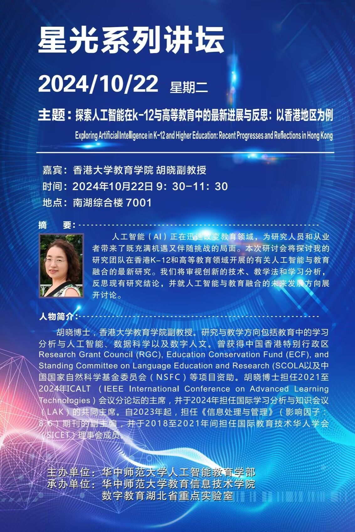 胡晓博士,香港大学教育学院副教授。研究与教学方向包括教育中的学习分析与人工智能、数据科学以及数字人文。曾获得中国香港特别行政区Research Grant Council (RGC), Education Conservation Fund (ECF), and Standing Committee on Language Education and Research (SCOLA以及中国国家自然科学基金委员会(NSFC)等项目资助。胡晓博士担任2021至2024年ICALT (IEEE International Conference on Advanced Learning Technologies)会议分论坛的主席,并于2024年担任国际学习分析与知识会议(LAK)的共同主席。自2023年起,担任《信息处理与管理》(影响因子:8.6)期刊的副主编,并于2018至2021年间担任国际教育技术华人学会(SICET)理事会成员。