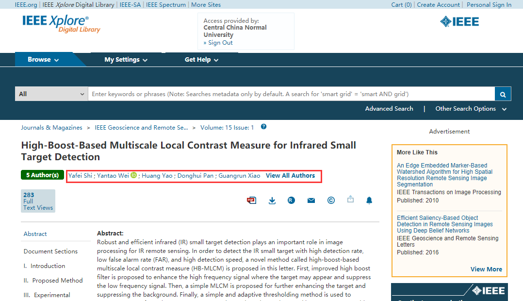 论文《High-Boost-Based Multiscale Local Contrast Measure for Infrared Small Target Detection》提出了一种基于高提升多尺度局部对比度测量的红外小目标检测方法。该研究对传统的高提升滤波方法进行了改进,使其更适合于小目标检测问题,另外,设计了一种多尺度的局部对比度测量方法对目标进行进一步提升,增加目标与背景之间的对比度。实验结果表明:该方法在实验数据集上较之经典的方法表现更好。该研究得到了国家自然科学基金(61502195)资助。我院2016级硕士研究生师亚飞同学为第一作者,魏艳涛老师为通讯作者,华中师范大学为第一完成单位。文章地址: