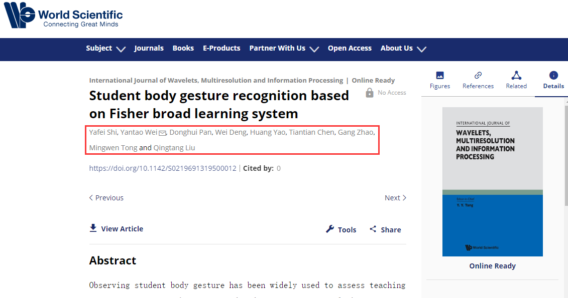 魏艳涛副教授团队接连在工程技术领域国际知名期刊上发表学术成果:《Student Body Gesture Recognition Based on Fisher Broad Learning System》(基于Fisher宽度学习系统的学生身体姿态识别)和《High-Boost-Based Multiscale Local Contrast Measure for Infrared Small Target Detection》(面向红外小目标检测的高提升多尺度局部对比度测量)。两篇论文分别发表在International Journal of Wavelets, Multiresolution and Information Processing(SCI,2017年IF=0.54)和IEEE Geoscience and Remote Sensing Letters(SCI,2017年IF=2.893)国际期刊上,第一作者均为魏艳涛老师指导的硕士研究生。